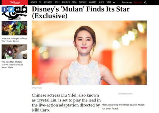劉亦菲出演《花木蘭》 成迪士尼動(dòng)畫(huà)改編真人電影女主