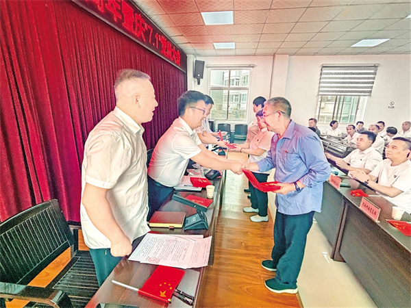 6月26日上午,嵐皋縣城關鎮(zhèn)西坡社區(qū)黨組織為黨齡滿50年的3名老黨員頒發(fā)“光榮在黨50年”紀念章,給每名參會黨員送上“政治生日賀卡”。魏代續(xù) 廖霖 攝