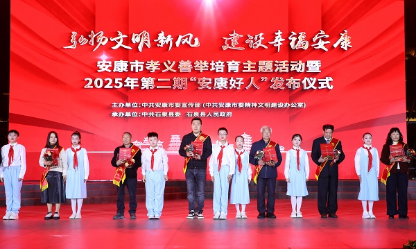 本次活動以“弘揚文明新風 建設(shè)幸福安康”為主題,由市委宣傳部主辦、石泉縣委和縣政府承辦,旨在深入學習貫徹黨的二十屆四中全會精神,扎實推進崇德向上幸福安康建設(shè)。活動現(xiàn)場,通過播放典型人物短片、現(xiàn)場互動訪談等形式,生動再現(xiàn)了陳登發(fā)、高虎、黃壽琴等好人代表的感人事跡。市級領(lǐng)導及“中國好人”“陜西好人”等先進典型代表為28名新入選的“安康好人”頒發(fā)紀念證書。活動現(xiàn)場同時發(fā)布了2025年安康市“新時代好少年”名單,24名青少年獲得殊榮。