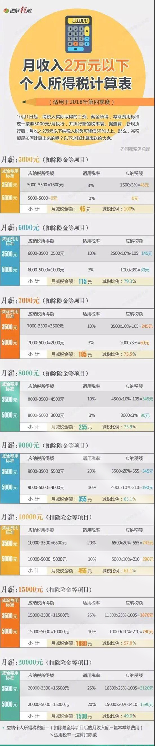 今年8月,新個稅法通過,“起征點(diǎn)”每月5000元,10月1日起實(shí)施。10月9日,國家稅務(wù)總局官方微信號對外公布“月收入2萬元以下個稅計算表”,月入2萬元以下能減多少稅?一查便知。