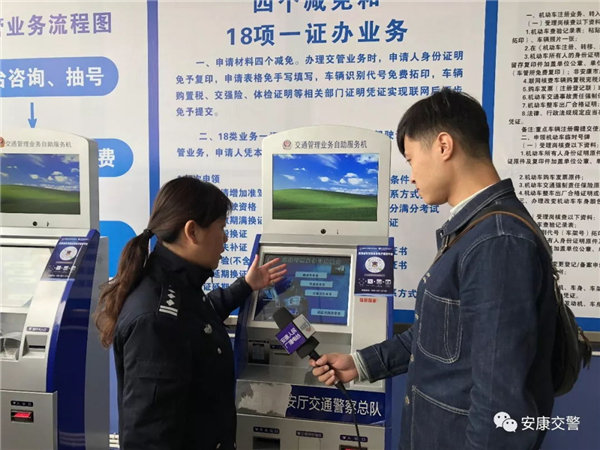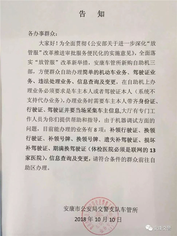 為全面貫徹落實公安部“放管服”改革新舉措,安康市公安局交警支隊車管所新購自助機三部,方便群眾自助辦理簡單的機動車、駕駛證、違法處理、信息查詢及變更等業(yè)務(wù),車主和駕駛員本人(系統(tǒng)不支持代辦業(yè)務(wù))只需持身份證、行駛證、駕駛證,當(dāng)場采集車主信息、辦理業(yè)務(wù)。車管所大廳自助服務(wù)設(shè)備目前能自助辦理的業(yè)務(wù)有8項::補領(lǐng)行駛證、換領(lǐng)行駛證、補領(lǐng)號牌、換領(lǐng)號牌、遺失補駕駛證、損壞補駕駛證、期滿換駕駛證(體檢醫(yī)院必須是聯(lián)網(wǎng)的13家醫(yī)院),信息查詢及變更。