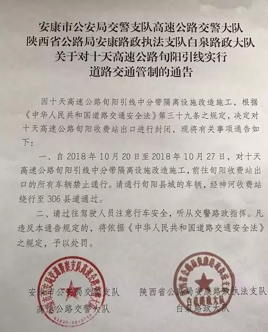 關(guān)于對十天高速公路旬陽引線實行道路交通管制的通告