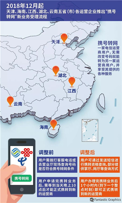 據(jù)工信部消息,率先試行的天津、海南、江西、湖北、云南五。ㄊ校⿵12月1日起,推出攜號(hào)轉(zhuǎn)網(wǎng)新業(yè)務(wù)受理流程,用戶可發(fā)送短信進(jìn)行攜轉(zhuǎn)資格查詢,辦理完攜轉(zhuǎn)業(yè)務(wù)后1個(gè)小時(shí)內(nèi)(到下一個(gè)整點(diǎn)時(shí)刻)即可正式攜轉(zhuǎn)到新的運(yùn)營(yíng)商。