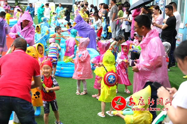 在“歡樂潑水節(jié)”活動中,繽紛泳裝秀、五彩的泡泡、水槍、蓄水池,雨衣等成了一道道靚麗的風景線;孩子們舉起水槍,家長們拿起小盆,你一槍,我一盆,他一桶“還擊戰(zhàn)”“追趕術(shù)”……尖叫聲、歡呼聲、笑聲、吶喊聲,此起彼伏,操場頓時變成了歡樂的海洋,宛若一個靈動的童年畫卷。