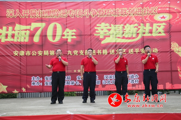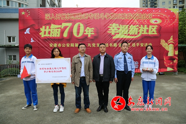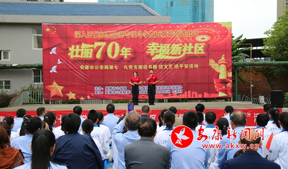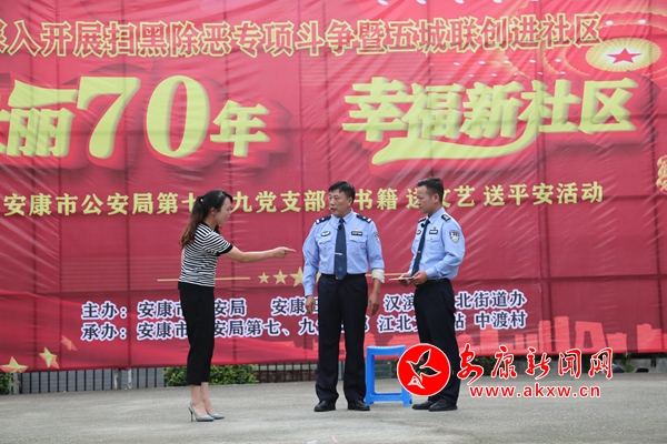 本網(wǎng)訊 (通訊員 周瑞儒)壯麗70年,幸福新社區(qū)。在新中國成立70周年即將來臨之際,9月21日上午,市公安局機(jī)關(guān)第七、第九黨支部深入漢濱區(qū)江北辦事處中渡社區(qū),開展掃黑除惡專項斗爭暨“五城聯(lián)創(chuàng)”進(jìn)社區(qū)“送書籍、送文藝、送平安”活動。市公安局、市創(chuàng)建辦、安康日報社、江北街道辦事處相關(guān)負(fù)責(zé)人,市公安局機(jī)關(guān)第七、第九黨支部全體民警輔警,市公安局創(chuàng)建辦、漢濱分局江北派出所負(fù)責(zé)人,江北高級中學(xué)學(xué)生代表、社區(qū)群眾200余人參加活動。