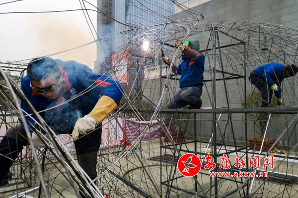 1月15日,工人們在西城閣制作新春主題燈飾。據(jù)現(xiàn)場負(fù)責(zé)人介紹,他們將會制作12組戶外燈飾,分別安裝在漢江一橋、三橋、水西門、金州廣場等地,扮靚一江兩岸。(潘……