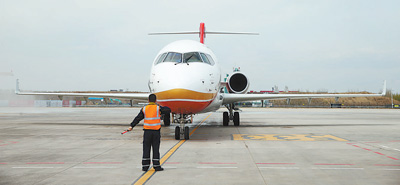 | 圖為5月2日,ARJ21—700新支線噴氣客機駛進哈爾濱太平國際機場停機坪。(記者 丁汀 攝) |