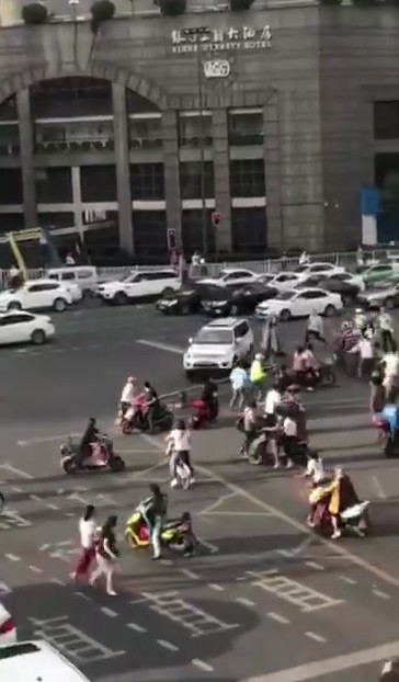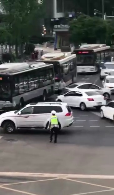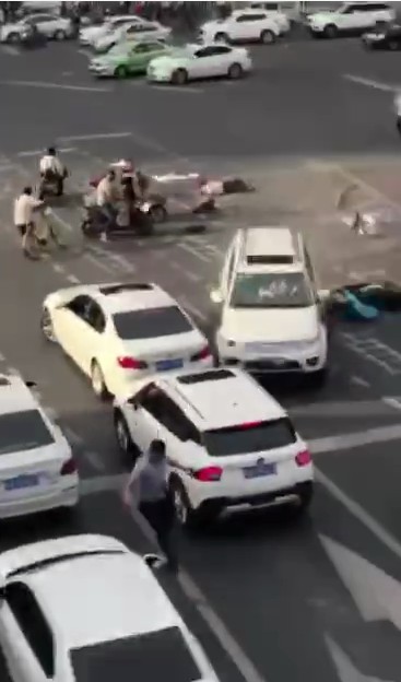 事故發(fā)生后,網(wǎng)上流傳著關于該案的現(xiàn)場視頻。一輛白色越野車在原地多次轉(zhuǎn)圈后,從順城大街逆向往鹽市口方向沖去,路口等待的多輛電瓶車被撞倒,最終撞向一輛白色汽車后停止。隨即,路口執(zhí)勤交警和公安將肇事車駕駛員控制。