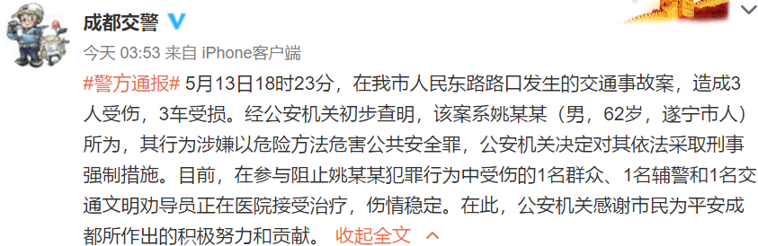 5月14日凌晨3時53分,成都交警通報,此事故造成3人受傷,3車受損。經(jīng)當?shù)毓矙C關初步查明,該案系62歲遂寧市姚某某所為,其行為涉嫌以危險方法危害公共安全罪,公安機關決定對其依法采取刑事強制措施。目前,在參與阻止姚某某犯罪行為中受傷的1名群眾、1名輔警和1名交通文明勸導員正在醫(yī)院接受治療,傷情穩(wěn)定。公安機關感謝市民為平安成都所作出的積極努力和貢獻。