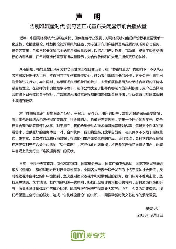 愛奇藝首席內(nèi)容官王曉暉對媒體稱,過度關(guān)注播放量給行業(yè)帶來了諸多不良影響,大量的優(yōu)質(zhì)作品因為缺乏客觀、公正的評估體系被埋沒。不少從業(yè)者更將播放量簡單攀比,扭曲了創(chuàng)作初心,甚至滋生出刷量等違法或者違反職業(yè)道德的行為。對于“唯播放量論”的不良現(xiàn)象,以及由此帶給產(chǎn)業(yè)鏈、平臺、制作方、用戶的傷害,我們保持高度的警惕。為了改變這種不良風氣,愛奇藝決定率先關(guān)閉前臺播放量顯示,將重心回歸創(chuàng)作并為用戶提供優(yōu)質(zhì)的內(nèi)容和服務體驗。