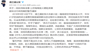 人民網(wǎng)北京5月14日電 (孝金波、楊思萱)5月12日,一網(wǎng)民在QQ群中公然發(fā)表侮辱救火犧牲消防戰(zhàn)士的言論,引起廣大網(wǎng)民憤慨和譴責(zé)。經(jīng)當(dāng)?shù)鼐秸{(diào)……
