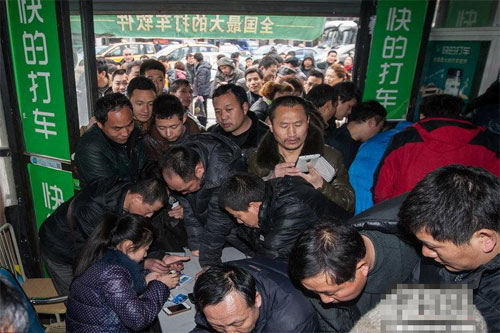 2014年2月19日,杭州“快的打車”服務(wù)點(diǎn),出租車司機(jī)們排隊(duì)安裝軟件。圖片來源:CFP視覺中國2014年2月19日,杭州,隨著“嘀嘀”、“快的”……