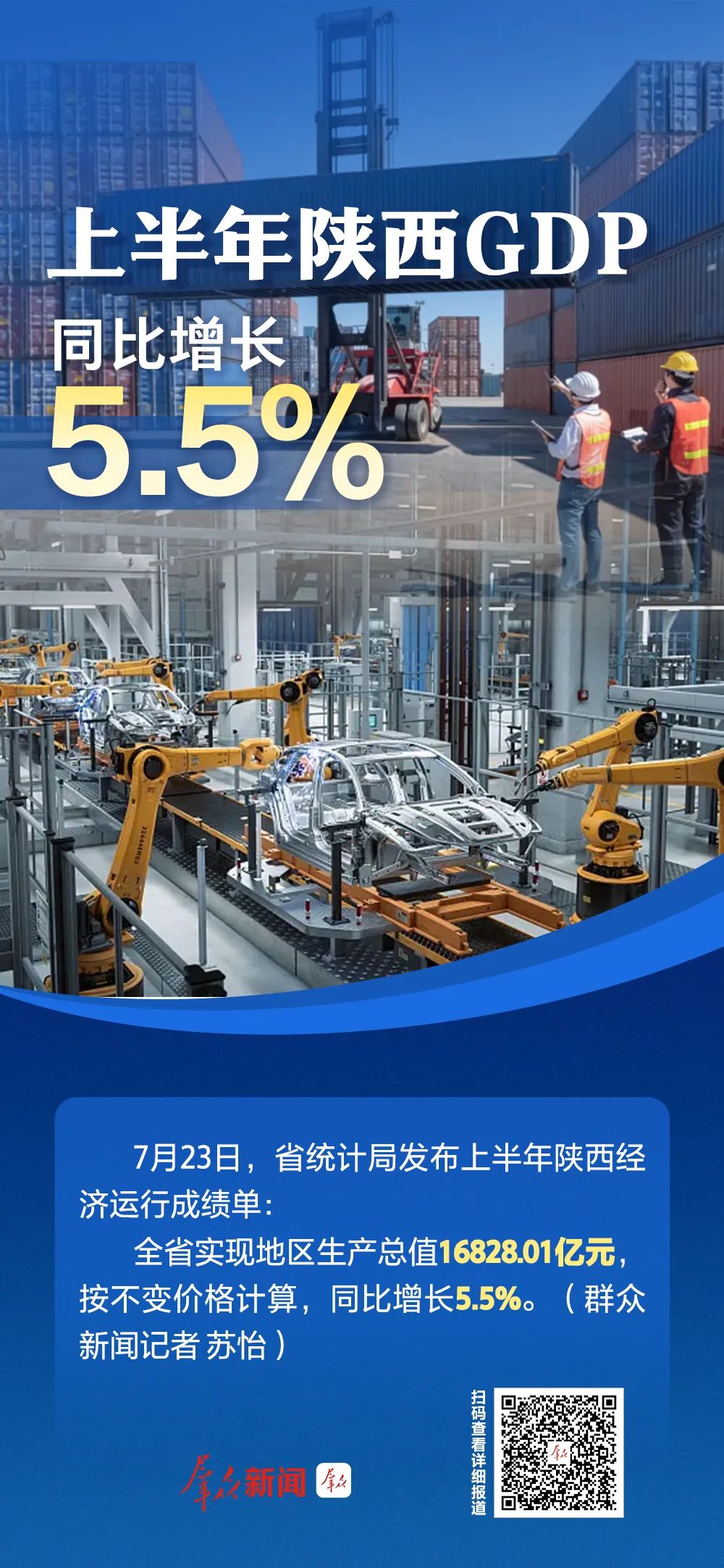 7月23日,省統(tǒng)計(jì)局發(fā)布上半年陜西經(jīng)濟(jì)運(yùn)行成績(jī)單:全省實(shí)現(xiàn)地區(qū)生產(chǎn)總值16828.01億元,按不變價(jià)格計(jì)算,同比增長(zhǎng)5.5%。