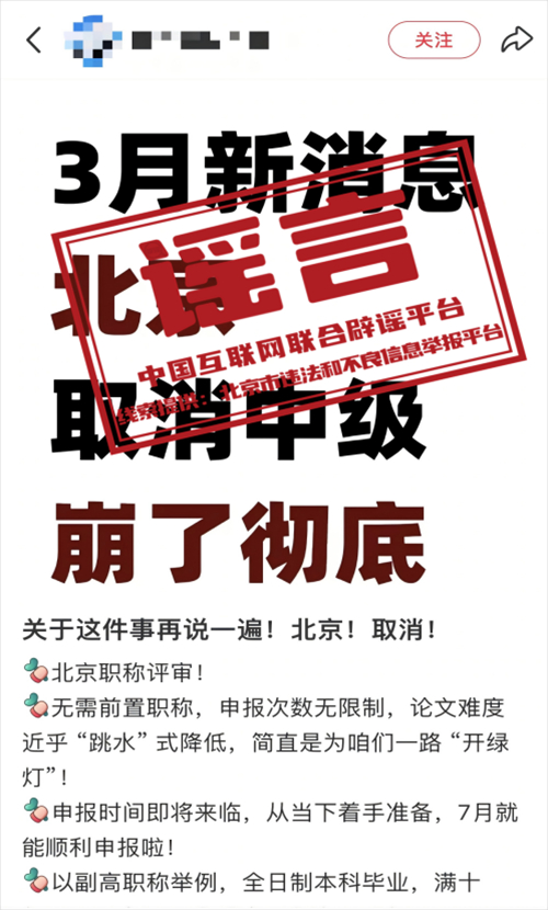 詳情:近期,2025年度職稱評審工作啟動后,網(wǎng)上流傳“北京取消中級職稱”的說法。經(jīng)核實,此言論不實,中級職稱并未取消。據(jù)北京市人社局介紹,申報人可以對照初級、中級、高級職稱不同層級的要求,根據(jù)自身情況申請職稱評審。不同系列的職稱申報具體要求不同,以工程技術(shù)系列為例,本科畢業(yè)需要先取得中級職稱,獲評中級職稱后從事本專業(yè)技術(shù)工作滿5年,才能申報高級職稱。(來源:“北京網(wǎng)絡(luò)舉報”微信公眾號)