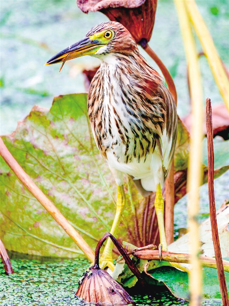 繁殖期頭及頸深栗色,胸醬紫色;非繁殖期背部褐色,頭、頸、上胸部具褐色縱紋,下腹部及翼為白色;嘴基黃而尖端黑色,跗趾黃色。非繁殖期飛行時(shí)因白色的腹部和飛羽,易與白鷺混淆,背部有深色陰影是其分辨特征。(來(lái)源:安康市林學(xué)會(huì)) Ntd安康新聞網(wǎng)