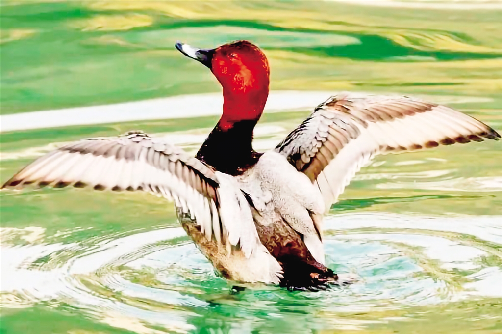 又名紅頭鴨,磯鳧。雄鳥頭部栗紅色,胸部黑色,背部及腹部灰白色,尾黑色,嘴藍灰色且端部黑色;雌鳥頭部及胸部暗褐色,背部及腹部灰色,尾部褐色,嘴基部色淺。紅頭潛鴨虹膜雄鳥紅色,雌鳥灰褐色,腳黑色。(來源:安康市林學會)FSQ安康新聞網(wǎng)