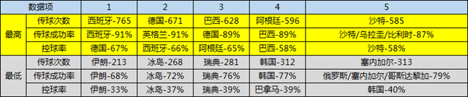 而在控球方面,崇尚傳控打法的球隊(duì)顯然會占據(jù)控球率的前列,但控球不等于贏球,將“Tika-Taka”玩的最熟練的顯然是西班牙,他們不僅有著場均765次的驚人傳球次數(shù)以及場均91%的傳球成功率,并依靠著前鋒迭戈-科斯塔的優(yōu)秀發(fā)揮,以小組第一順利出線;而與此形成鮮明對比的是一向以簡單、高效打法著稱的德國隊(duì),居然也開始走上了“Tika-Taka”的路線,3場小組賽,德國擁有32支球隊(duì)最高的控球率67%(比西班牙的66%還高),同時居然也擁有場均671次的傳球次數(shù)和89%的傳球成功率,但遺憾的是勒夫的“無鋒”戰(zhàn)術(shù),讓進(jìn)攻的最后關(guān)頭啞了火。