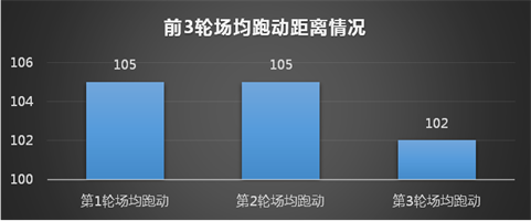 本屆世界杯小組賽,場均跑動距離為104km,三輪的場均跑動距離分別為:105km、105km和102km。
