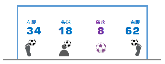 本屆世界杯小組賽中球員用右腳打入62粒進(jìn)球、左腳34粒、有18粒進(jìn)球是用頭球打入(未統(tǒng)計(jì)8粒烏龍球的踢球部位),而進(jìn)球方式中,除普通進(jìn)球方式外,點(diǎn)球和頭球各打入了18粒進(jìn)球。