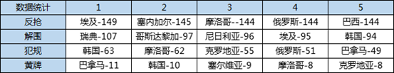 本屆世界杯小組賽的主要防守?cái)?shù)據(jù)統(tǒng)計(jì)如下: