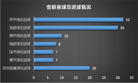 從小組賽進(jìn)球的球員所屬聯(lián)賽分布來看,來自14個國家的21名西甲球員包辦了最多的32粒入球,英超球員打入了30粒進(jìn)球排名第二,來自五大聯(lián)賽的德甲、法甲、意甲球員分別打入了10粒、7粒和7粒,值得一提的是,來自3個國家的5名俄超聯(lián)賽球員共打入了8粒進(jìn)球,排名第4,而來自廣州恒大淘寶的韓國球員金英權(quán)是中超球員打入世界杯入球的唯一球員。
