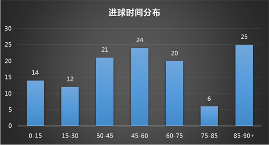 本屆世界杯讓大家印象深刻的是出現(xiàn)了多場比賽的絕殺與絕平的比賽,而從進(jìn)球時間分布來看,也印證了這一點(diǎn),據(jù)統(tǒng)計(jì),在比賽的85+分鐘進(jìn)球的數(shù)量達(dá)到了25粒,占總進(jìn)球的20.5%,其次是下半場開場后的15分鐘,進(jìn)球數(shù)達(dá)到了24粒。